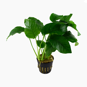 Esta variedade de Anubias destaca-se pelas suas folhas ovais, grandes e verde-escuras, que podem atingir até 25 cm de altura e 12 cm de largura, tornando-a ideal para o plano médio ou traseiro do aquário.